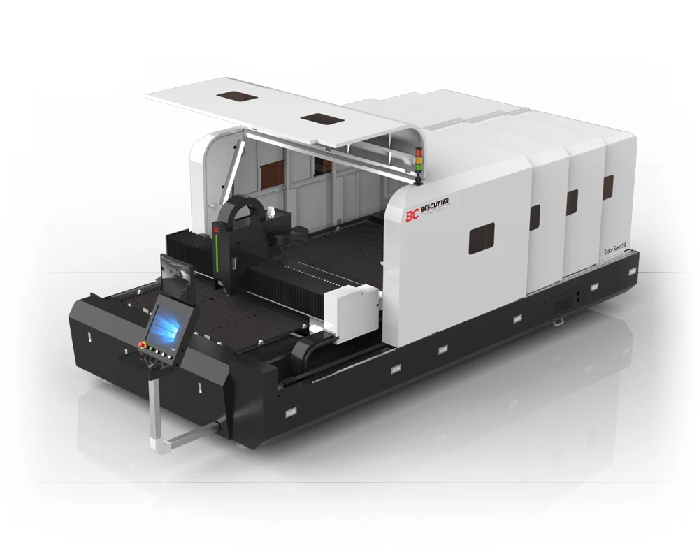 IPG Laser ResonatorCompact design with safety enclosure. Ideal for shop with limited space.Full enclosure with retractable housing. Easy loading and unloading.Space Saving: no exchange table.High rigidity enhanced aviation aluminum gantry.Rack and pinion structure, servo drive, secondary annealing treatment of high rigid welding frame with high accuracy and stability.